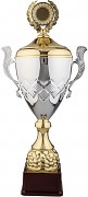 Tato trofej se vyznačuje elegantní kombinací stříbrno-zlaté barvy a hnědého podstavce, což jí dodává sofistikovaný vzhled. Velký kovový kalich s uchy je vyroben z kvalitního materiálu, což zajišťuje jeho trvanlivost a odolnost. Poklice s prostorem pro emblém o průměru 5 cm umožňuje personalizaci, což z ní činí ideální dárek nebo ocenění pro vítěze.
