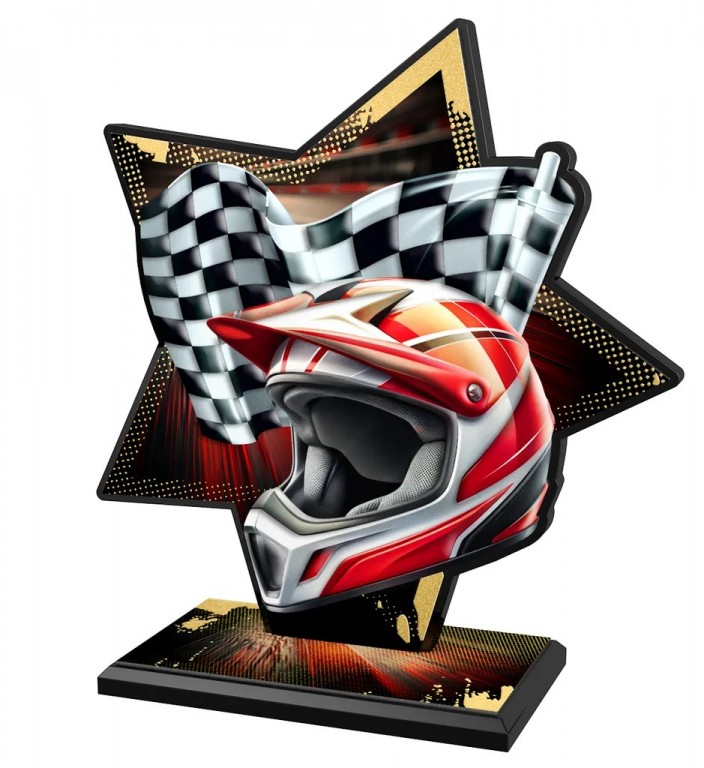 Kovová trofej SAM01M09 | Motorsport Elegantní a originální trofej vyrobená z černého akrylu o tloušťce 8 mm. Na přední straně je umístěn detailně zpracovaný kovový motiv o tloušťce 1 mm, vytvořený speciální technologií 2D tisku s lakem, která dodává motivu výraznou hloubku a lesk.