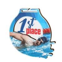 Medaile MDAW001M13 | Plavání Kombinace dřeva a akrylu. Vnitřní část průhledná. Tloušťka 0.6cm. Cena včetně stuhy. Texty uvedené na medailích jsou ilustrační. Možnost vložení textu/loga/názvu přímo do medaile.