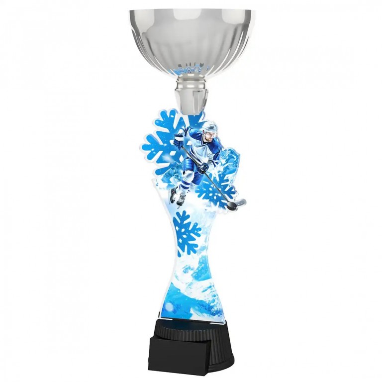 Akrylátová trofej. V ceně trofeje není zahrnuta cena štítku. Akrylátový motiv 0.6 cm. Stříbrný kalich. Výšky trofejí jsou orientační. Oboustranný tisk.