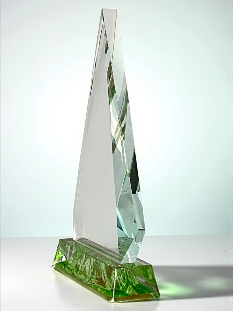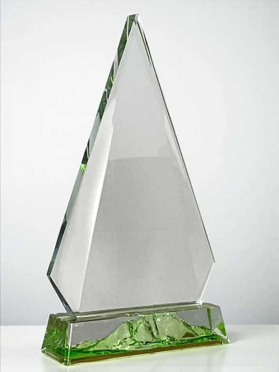Elegantní skleněná trofej ve tvaru vrcholu s tloušťkou skla 1,5 cm a stylovou zelenou základnou. Ideální pro ocenění úspěchů, personalizovatelná dle vašeho přání.